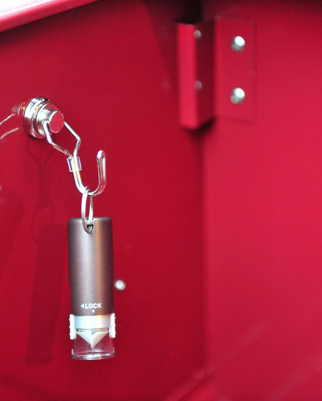 ハンドルを回すと上部があき、引き出しの中に荷物を入れて引き出しを閉めます。