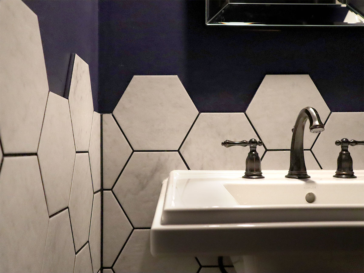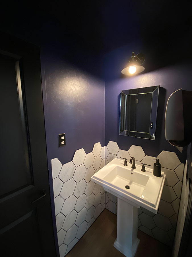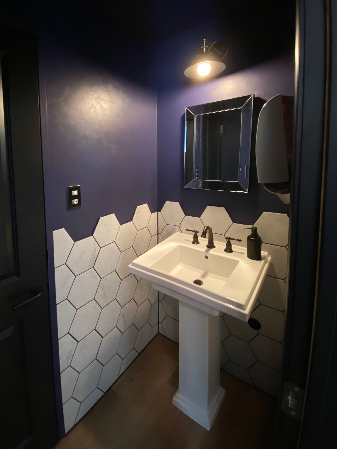 洗面スペースには紫のペイント壁に六角形タイルの立ち上がり壁を施すことで防水性を兼ね備えた力強いデザインとなりました。自然石のマーブル模様や凹凸を再現したイタリアンタイルの美しいテクスチャーと、六角形のシルエットが空間に大きなインパクトをもたらします。