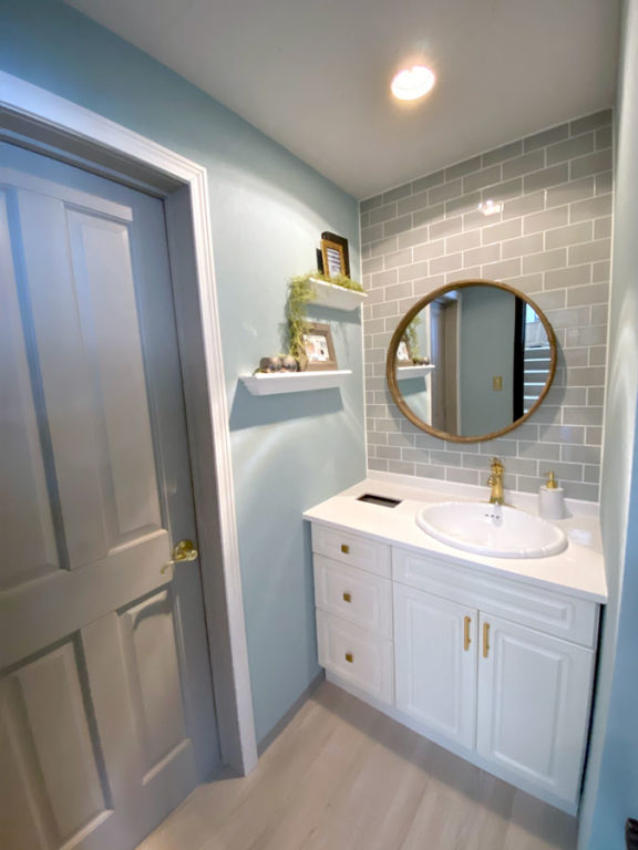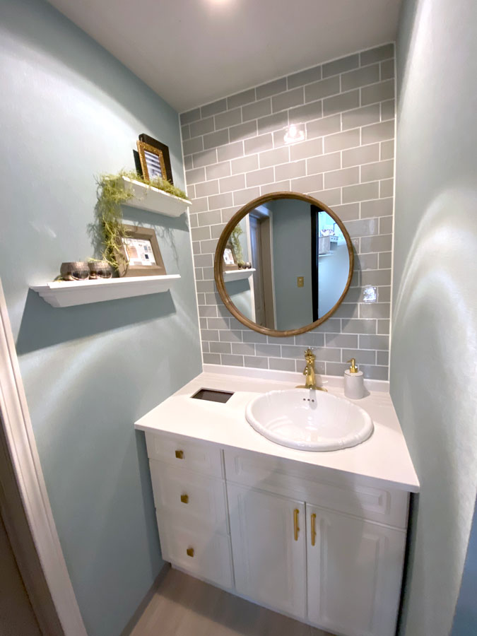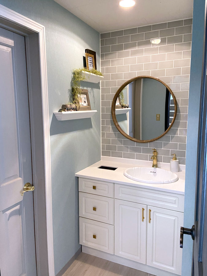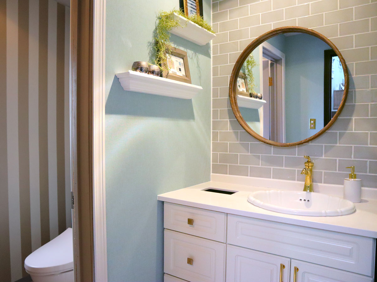 洗面スペースは女性に人気のカラー水色をモチーフとし、爽やかで明るいイメージのデザイン。