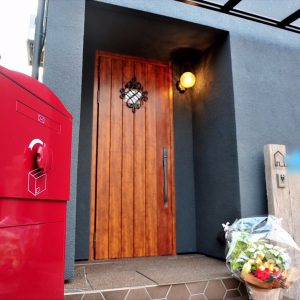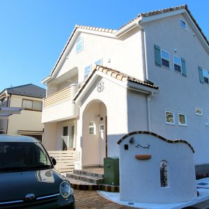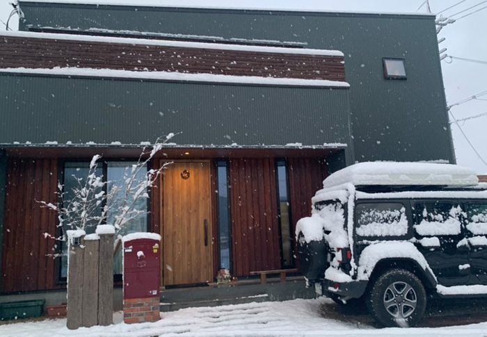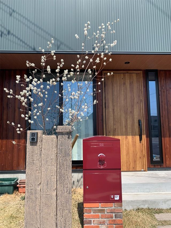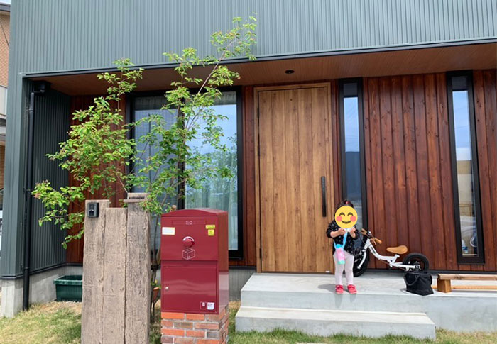 モスグリーン外壁の自宅、芝生、季節問わず映える色合いと形がお気に入りです。