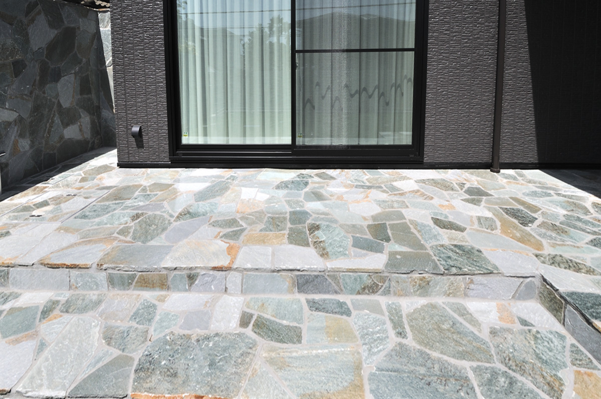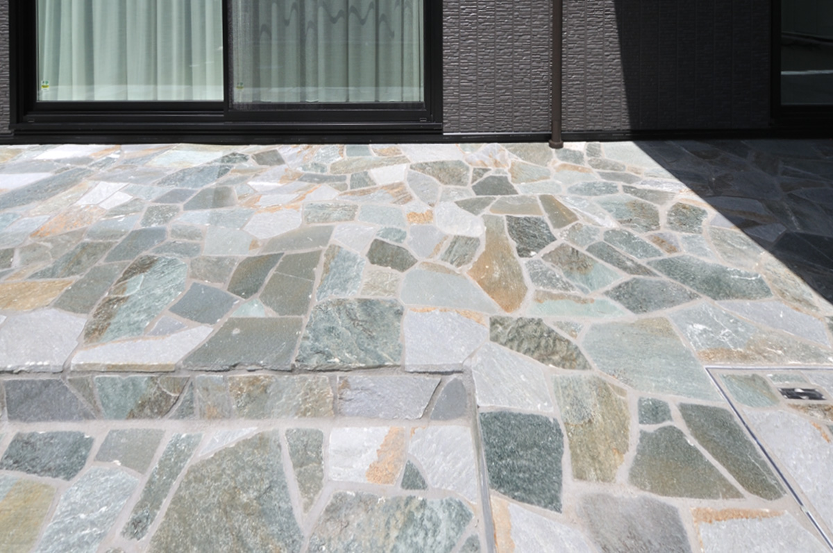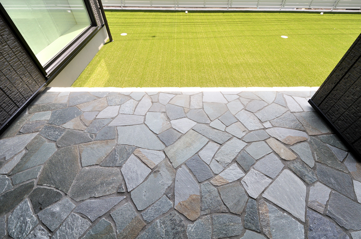 乱形石のデッキテラスには名古屋モザイク工業「クォーツストン」を採用。人工では創り出すことのできない美しい色と模様は、自然石ならではの味わい。