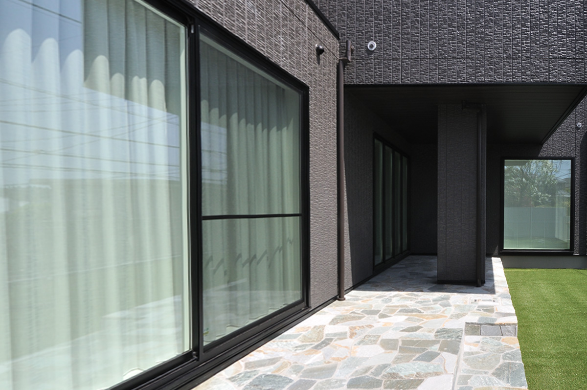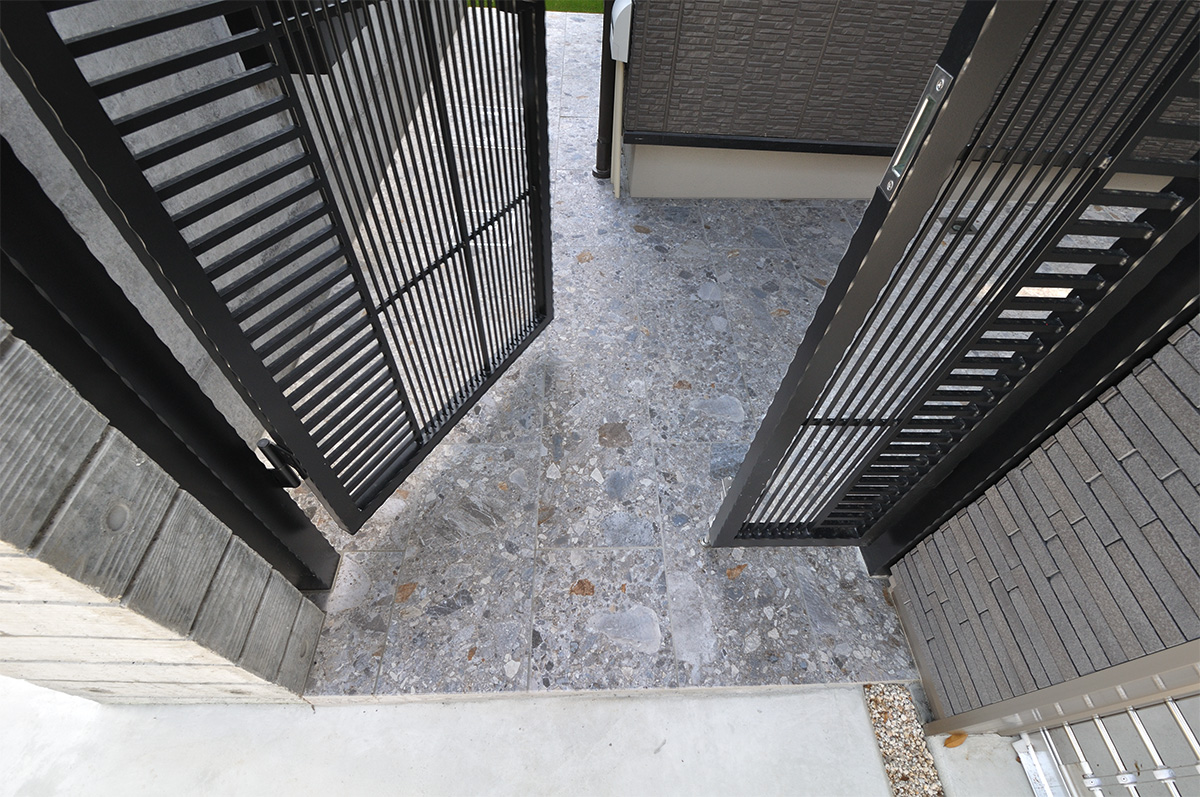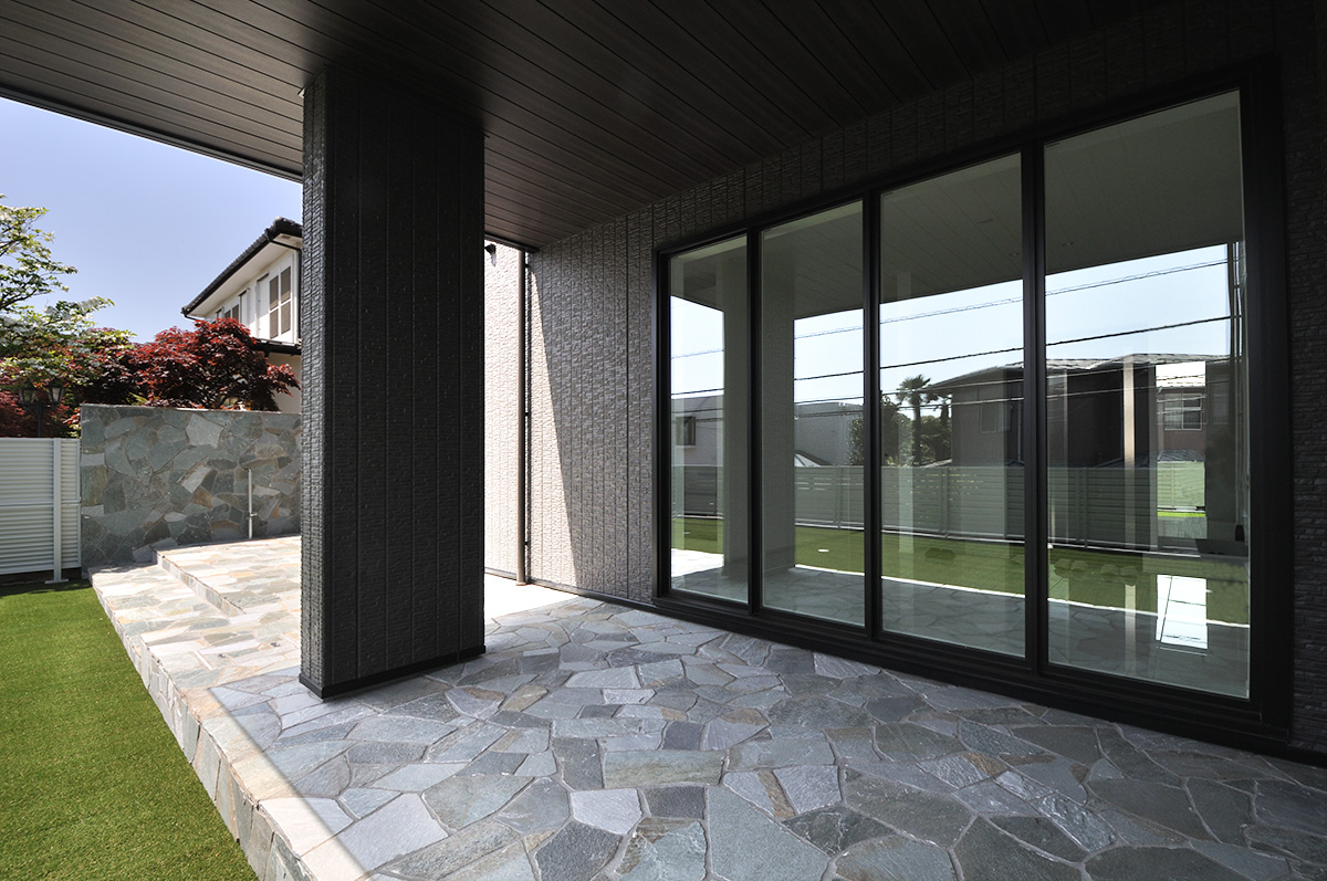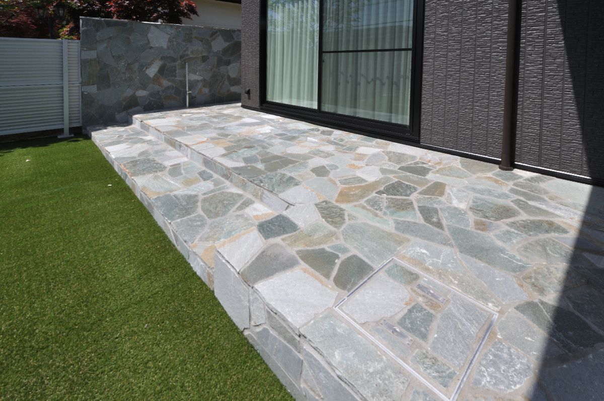 乱形石のデッキテラスには名古屋モザイク工業「クォーツストン」を採用。人工では創り出すことのできない美しい色と模様は、自然石ならではの味わい。