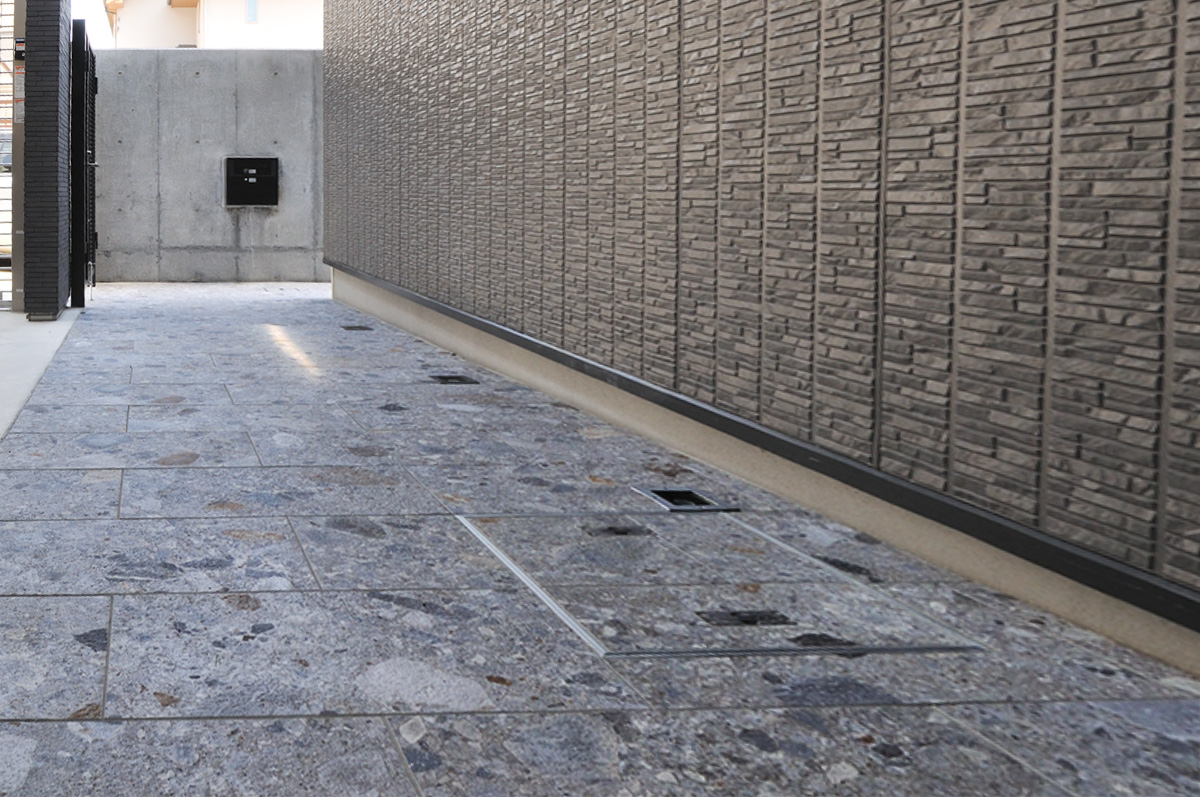 テラス地面の雨水枡には化粧枡を使用することで、意匠を損ねないよう配慮。