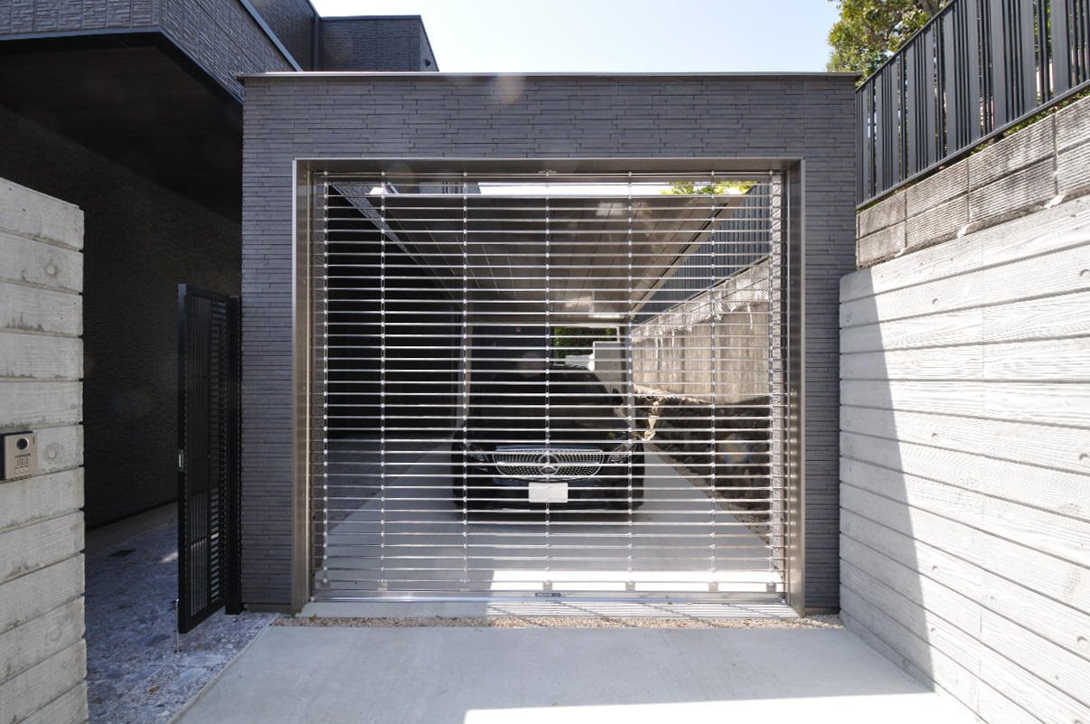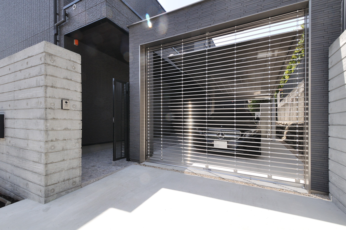 シャッターガレージのタイルは建物本体と相性が良いカラーで、一体感を感じさせます。