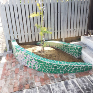 - 中庭テラス壁・乱形石:名古屋モザイク工業「クォーツストン・乱形割肌」SA-RANKEI(E)