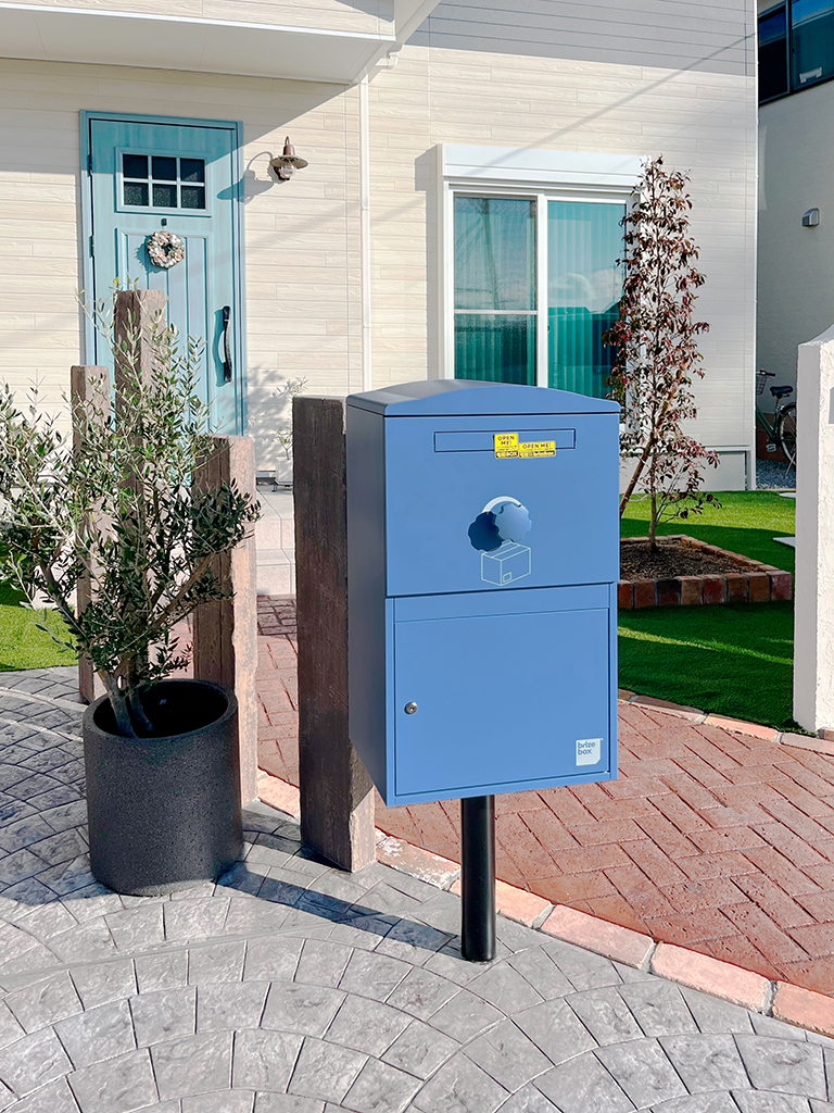 水色の玄関扉に合わせようと、宅配ボックスを探していました。