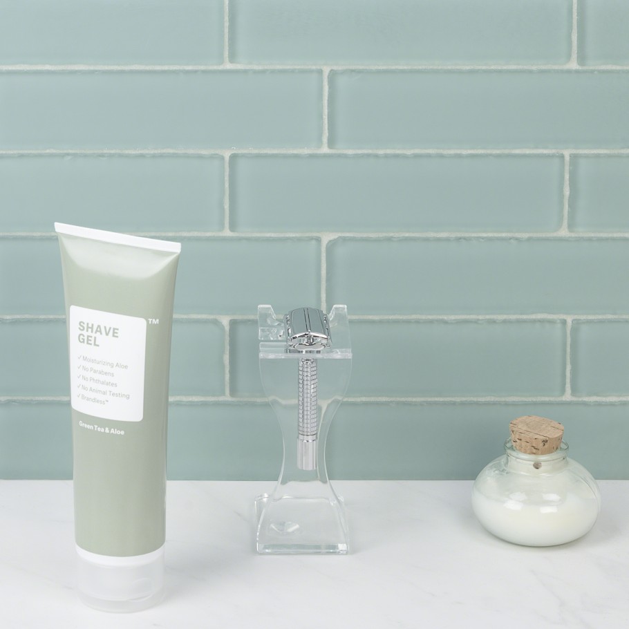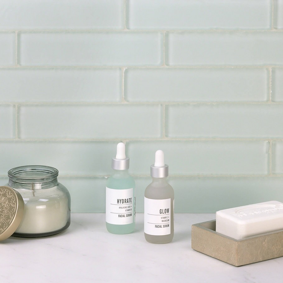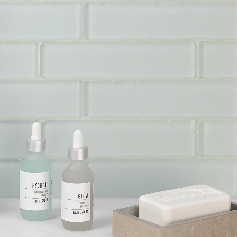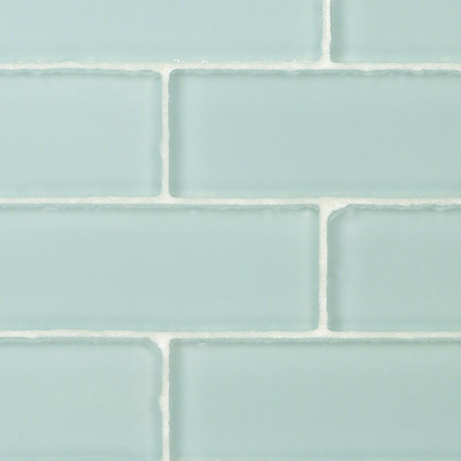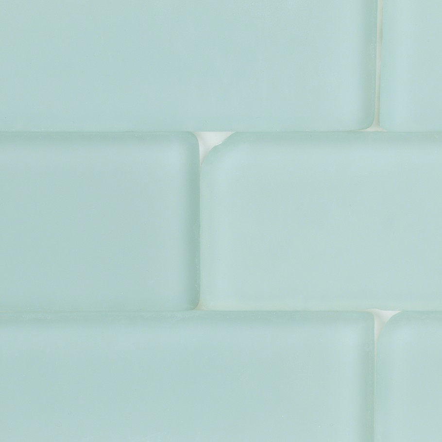 珍しいすりガラスのサブウェイタイル。シーグラスを彷彿とさせる美しいタンブルエッジが特徴。