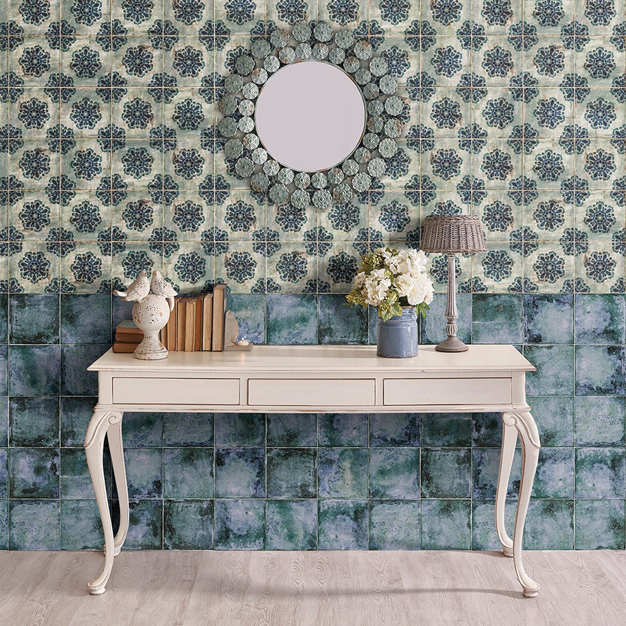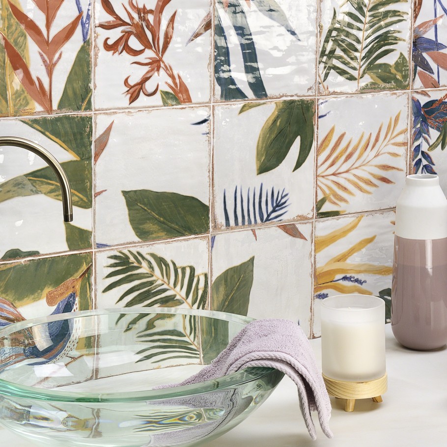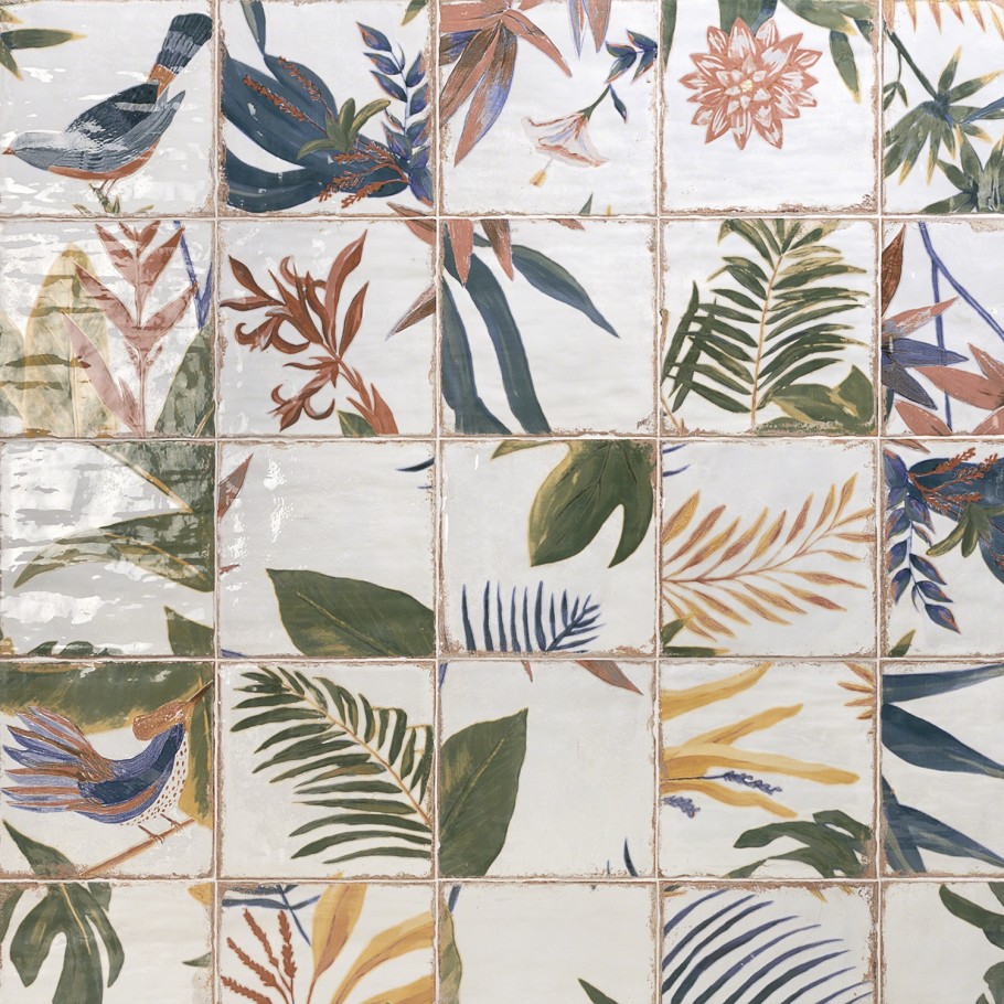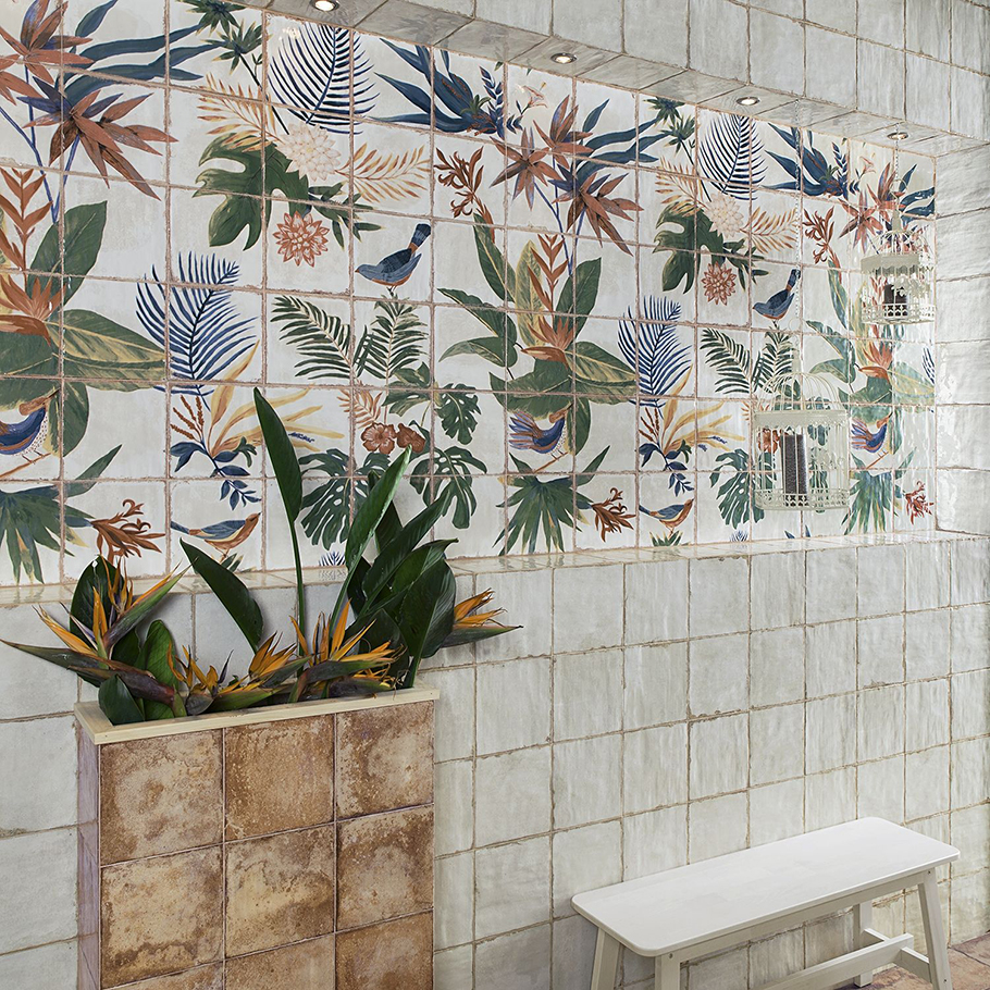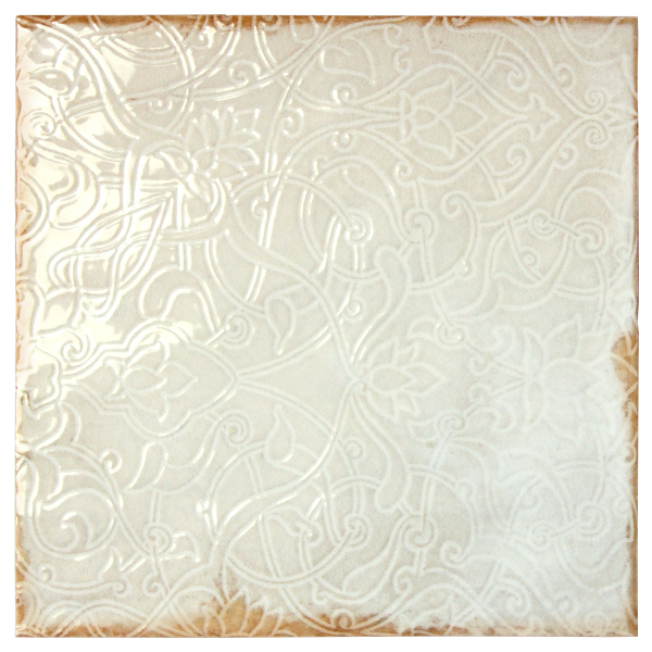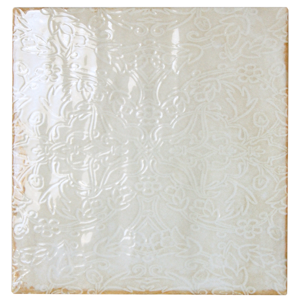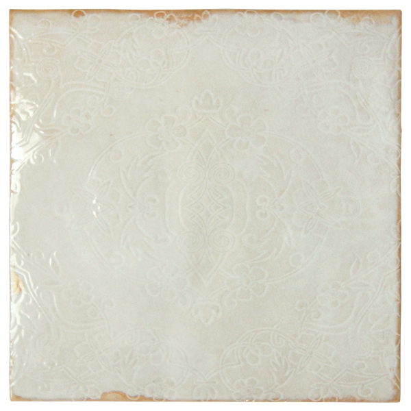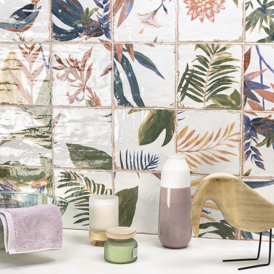 絶妙な陰影でユーズド感のあるツタ模様が描かれたアンティークな柄タイルは、時代を超越した多次元の雰囲気を与えます。
