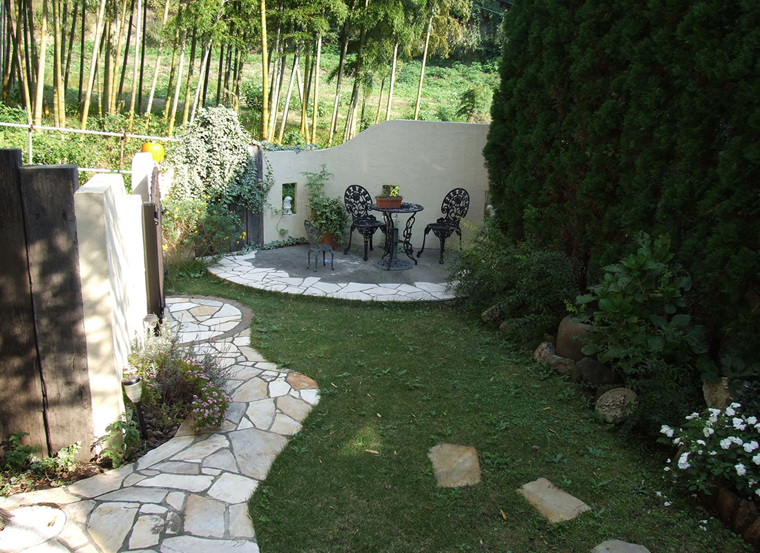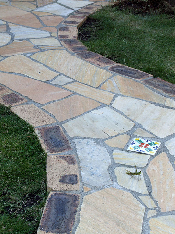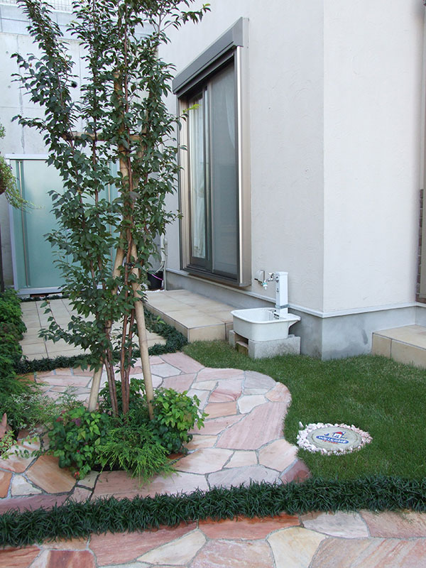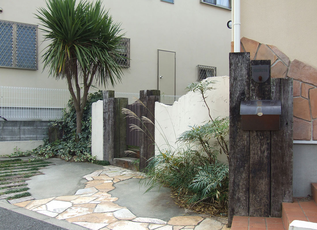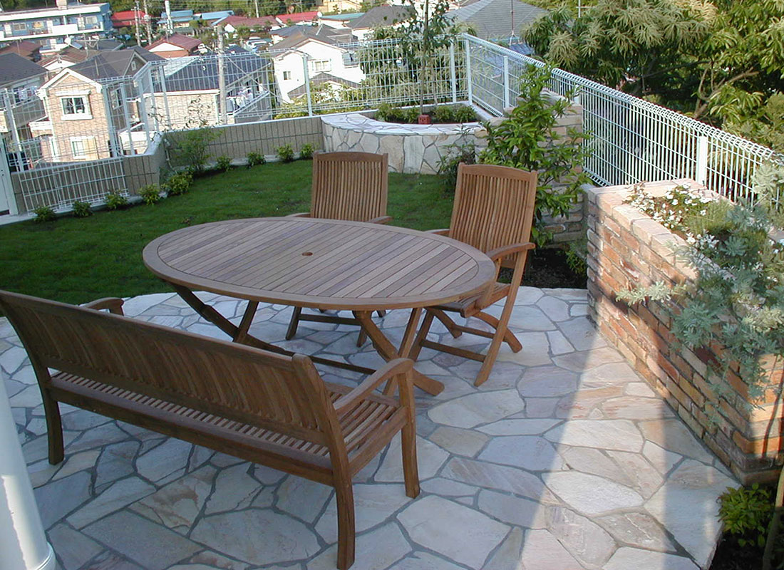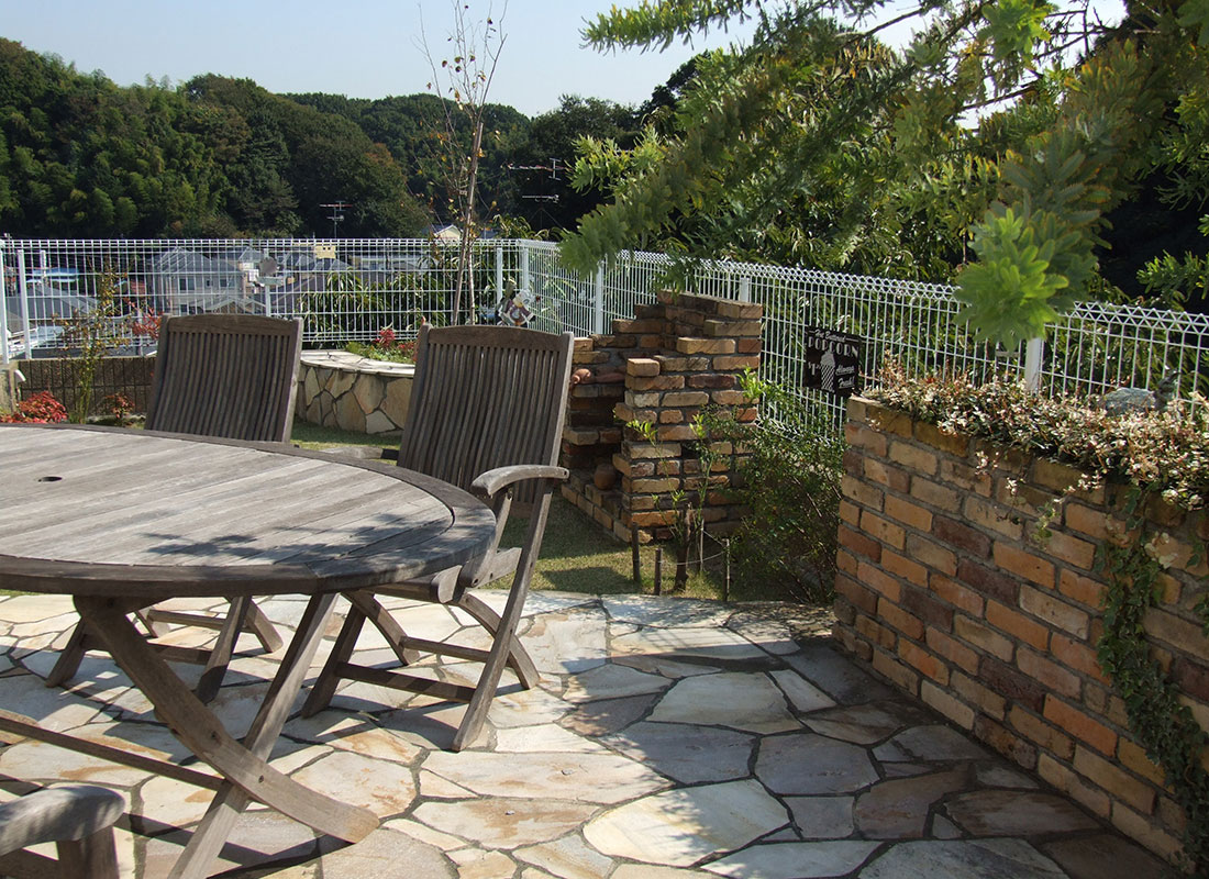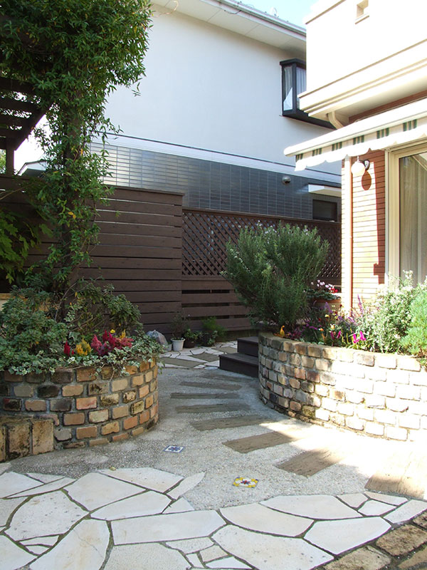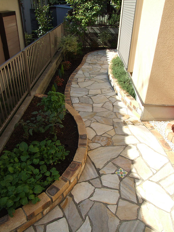 レンガとも相性抜群な足元に光を差してくれる色とりどりの天然石。フラットな面状なので壁面に貼りやすく、滑りにくい仕上がりは雨で濡れる屋外床にもお勧めです。