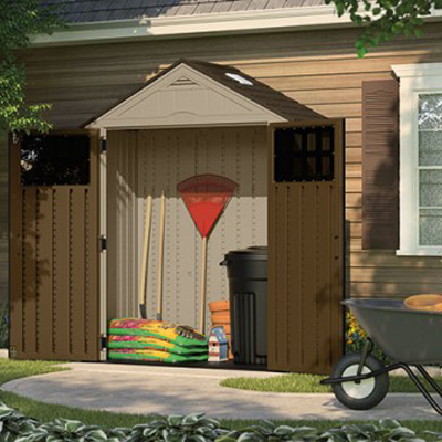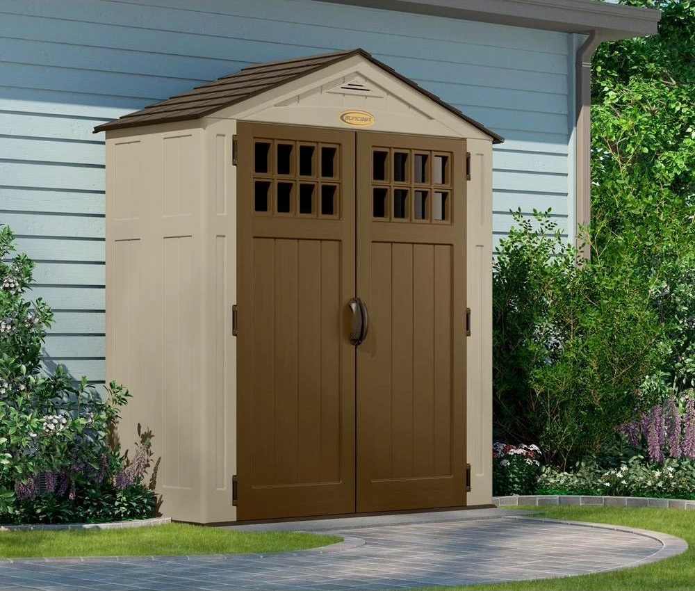 SUNCASTの樹脂製物置は、アメリカントラディッショナルなウッドデザイン。二重壁構造で強度、断熱性に優れています。
