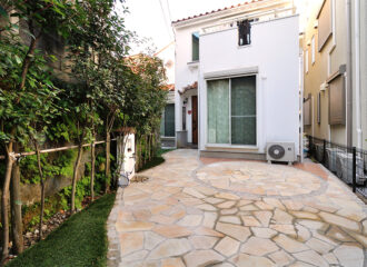 南欧風のエクステリア〜アプローチ空間に乱形石アルビノイエローなどを施工。