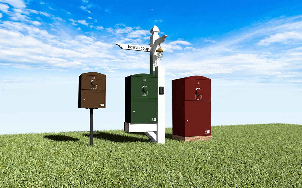 「Brizebox」のご提案がますます便利に。3サイズ8色の本体バリエーションはもちろん、ポール、機能門柱バイナルスタンド、据え置き台座など多様な施工オプションにも対応可能です。